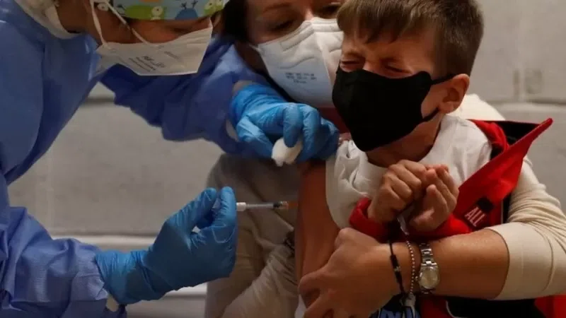Menino recebe dose da vacina da Pfizer contra a Covid-19 em Roma, na Itália, em 15 de dezembro, dia que marcou o início da vacinação de...
