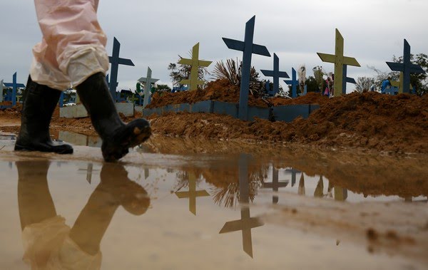 Coveiro caminha em meio a lápides de vítimas da Covid-19 no cemitério Parque Tarumã, em Manaus, em 25 de fevereiro. — Foto: Bruno Kelly/Reuters O Amazonas...