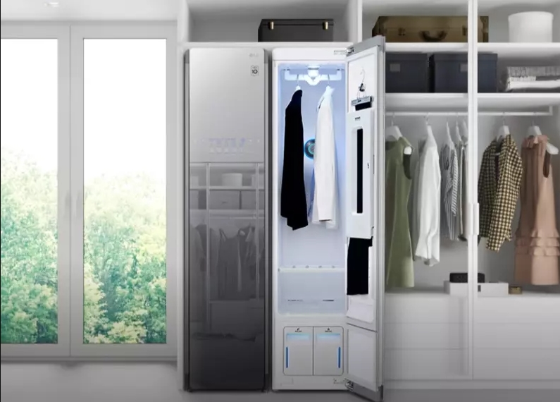 O eletrodoméstico tem um design que lembra uma junção de um armário com uma geladeira. A roupa fica pendurada num cabideiro, onde passa por um processo de higienização — segundo a marca, a máquina elimina até 99,9% de odores, germes e bactérias.