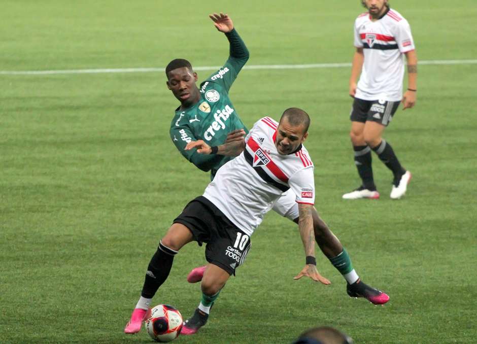O jogo – O primeiro tempo foi marcado pela forte disciplina tática de ambos os lados. Marcando a saída de bola e oferecendo poucos espaços no campo, tanto São Paulo quanto Palmeiras enfrentavam dificuldades para chegar ao gol. Ainda assim, logo aos seis minutos o Verdão assustou pela primeira vez. Rony cruzou no segundo pau, e Victor Luis apareceu para completar, mas foi atrapalhado por Daniel Alves, que fez o corte.