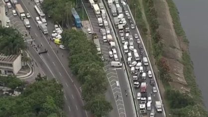 Um grupo de caminhoneiros e motoristas de veículos de transportes como vans e furgões realiza um protesto na manhã desta sexta-feira (5) na Marginal Tietê, em São Paulo. As informações são...